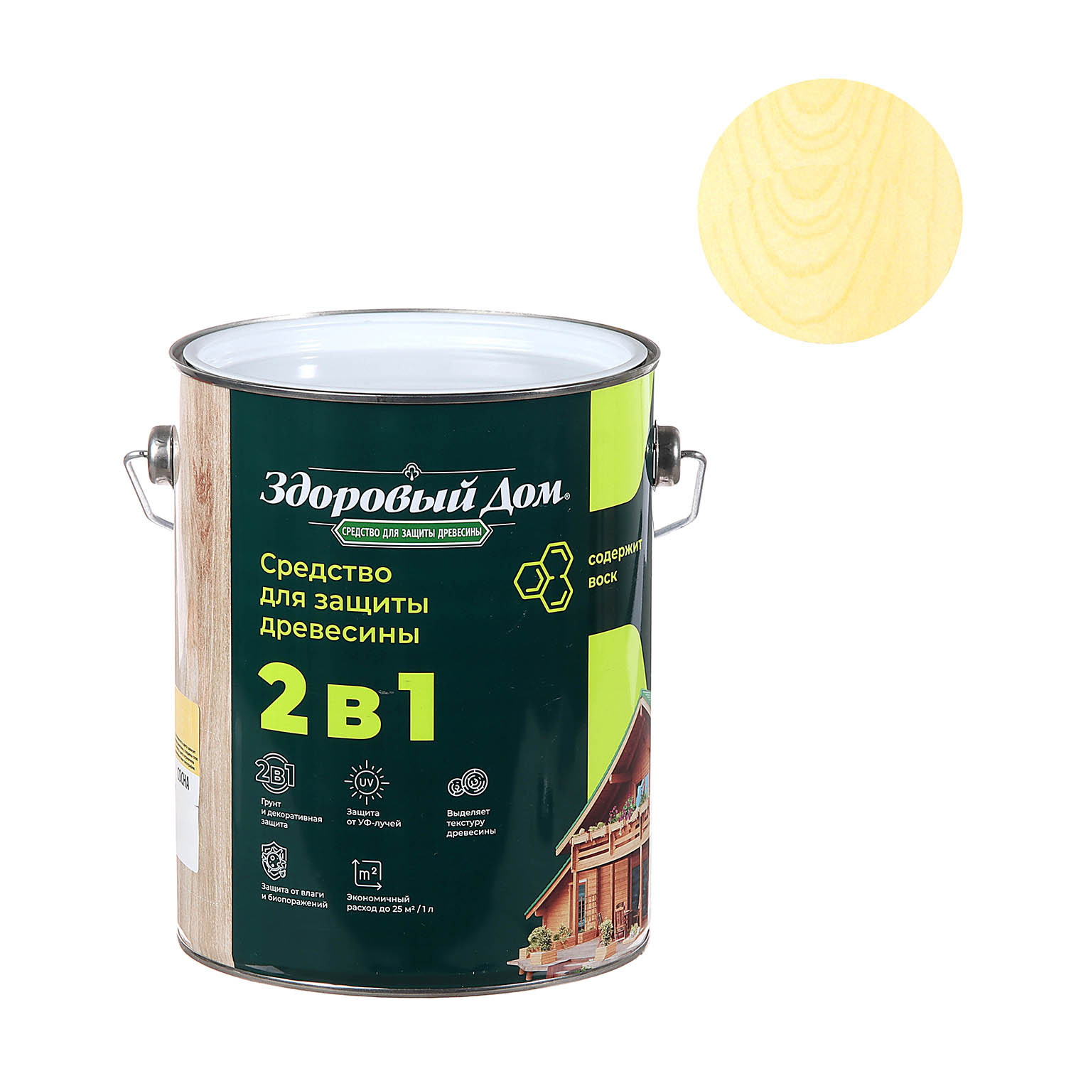 Деревозащитное средство Здоровый дом 2 в 1 сосна 2.7 л представляет собой высокоэффективное покрытие для декоративной отделки древесины и защиты поверхностей на срок до 8 лет. Формула 2 в 1 позволяет наносить состав без предварительного использования грунта.